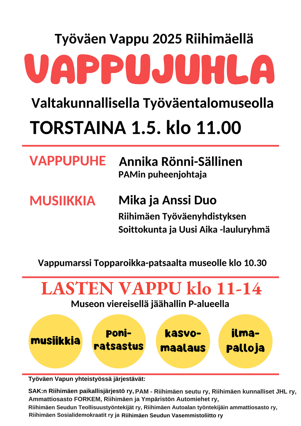 Työväen Vapun järjestävät yhteistyössä SAK:n Riihimäen Paikallisjärjestö ry, Riihimäen Sosialidemokraatit ry ja Riihimäen Seudun Vasemmistoliitto ry.